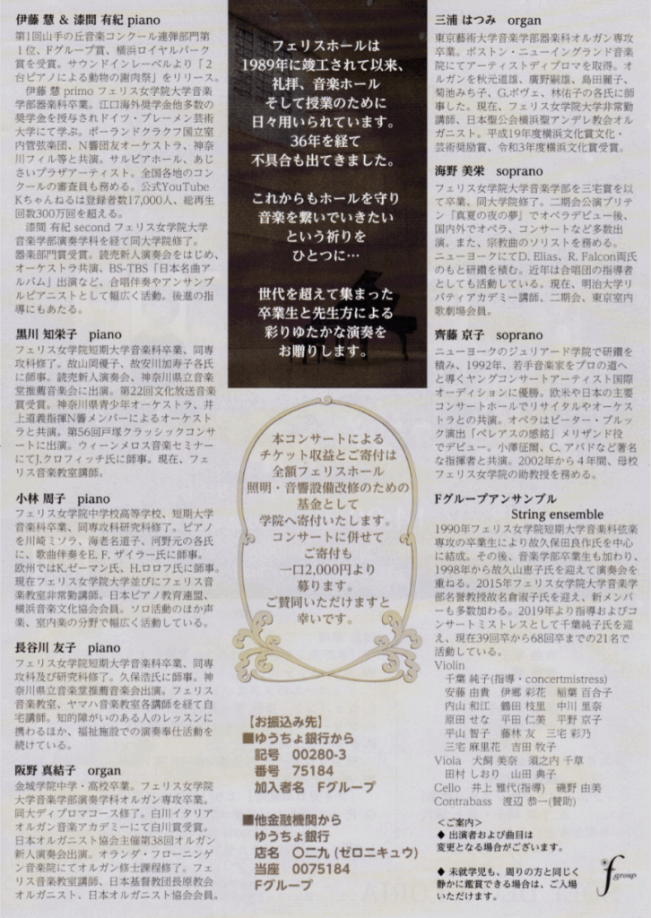 2025/08/14 チラシ表面 チラシ裏面 2026年3月28日(土)13時30分開場 14時開演 フェリスホール ※お申込み後、振込先をお知らせいたします。お振込完了後チケット発送致します。 件名 2026年3月28日土曜日 14:00〜(13:30開場) お名前 (必須) フリガナ (必須) ご選択下さい。ーーーーーーーーFグループ会員(音楽学部卒業生)フェリス関係者(卒業生/教職員)一般 Fグループの方は、こちらも選択下さい。 ーーーーーーーー74回 (2025年/2024年度卒)73回 (2024年/2023年度卒)72回 (2023年/2022年度卒)71回 (2022年/2021年度卒)70回 (2021年/2020年度卒)69回 (2020年/2019年度卒)68回 (2019年/2018年度卒)67回 (2018年/2017年度卒)66回 (2017年/2016年度卒)65回 (2016年/2015年度卒)64回 (2015年/2014年度卒)63回 (2014年/2013年度卒)62回 (2013年/2012年度卒)61回 (2012年/2011年度卒)60回 (2011年/2010年度卒)59回 (2010年/2009年度卒)58回 (2009年/2008年度卒)57回 (2008年/2007年度卒)56回 (2007年/2006年度卒)55回 (2006年/2005年度卒)54回 (2005年/2004年度卒)53回 (2004年/2003年度卒)52回 (2003年/2002年度卒)51回 (2002年/2001年度卒)50回 (2001年/2000年度卒)49回 (2000年/1999年度卒)48回 (1999年/1998年度卒)47回 (1998年/1997年度卒)46回 (1997年/1996年度卒)45回 (1996年/1995年度卒)44回 (1995年/1994年度卒)43回 (1994年/1993年度卒)42回 (1993年/1992年度卒)41回 (1990年卒)40回 (1989年卒)39回 (1988年卒)38回 (1987年卒)37回 (1986年卒)36回 (1985年卒)35回 (1984年卒)34回 (1983年卒)33回 (1982年卒)32回 (1981年卒)31回 (1980年卒)30回 (1979年卒)29回 (1978年卒)28回 (1977年卒)27回 (1976年卒)26回 (1975年卒)25回 (1974年卒)24回 (1973年卒)23回 (1972年卒)22回 (1971年卒)21回 (1970年卒)20回 (1969年卒)19回 (1968年卒)18回 (1967年卒)17回 (1966年卒)16回 (1965年卒)15回 (1964年卒)14回 (1963年卒)13回 (1962年卒)12回 (1961年卒)11回 (1960年卒)1-10回 (1950-59年卒)大学院修了(回は備考へ) チケット種別ご選択ください (選択必須) 一般3000円寄付つき5000円 枚数ご選択下さい ーーーーーーーー1枚2枚3枚4枚5枚6枚7枚8枚9枚 チケット種別ご選択ください (別券種もお求めの方のみ) ーーーーーーーー一般3000円寄付つき5000円 枚数ご選択下さい ーーーーーーーー1枚2枚3枚4枚5枚6枚7枚8枚9枚 メールアドレス Japan 郵便番号 住所 日中連絡のとれる電話番号 備考 10枚以上の方、お問い合わせ事項などありましたらお書きください。 この内容で送信する(入力内容確認の上チェックしてください) Δ
