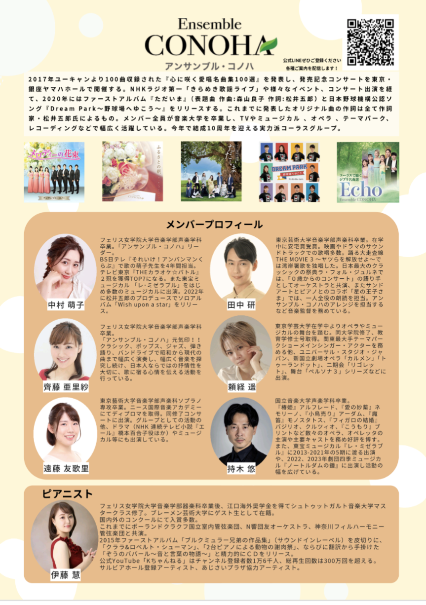 プロのコーラスグループ「アンサンブル・コノハ」と、ピアニスト伊藤慧が、昭和を彩った名曲の数々を、美しいハーモニーでお届けする特別公演。